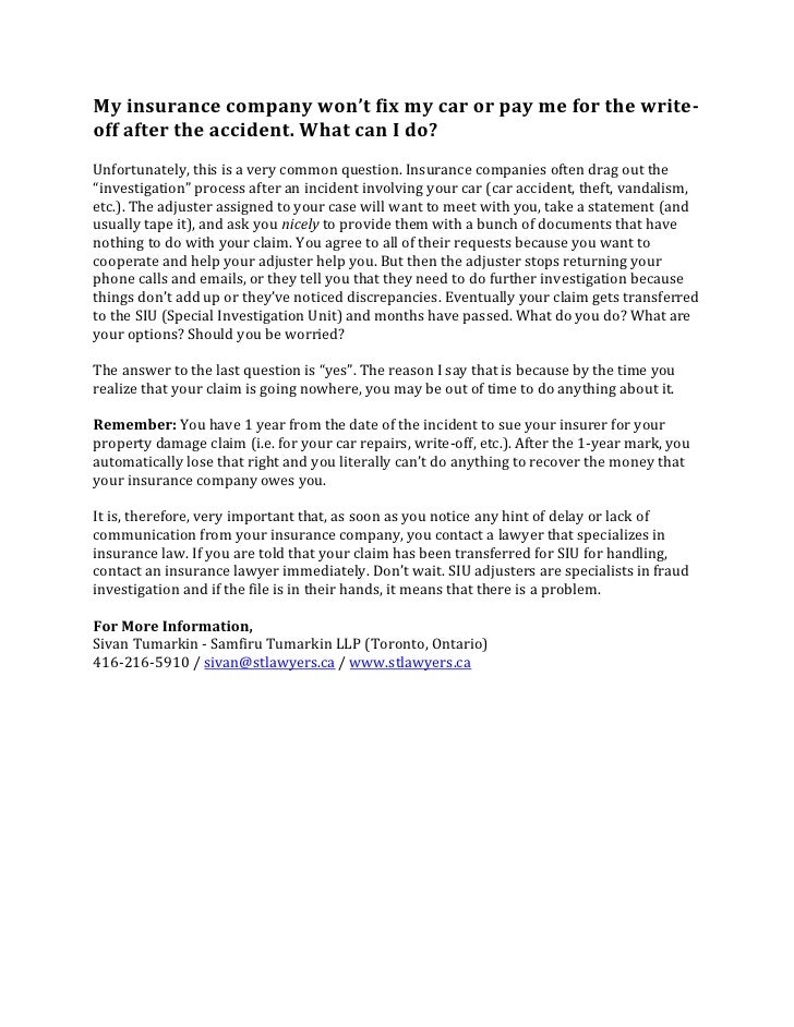 What if the insurance company say they will not pay for repairs to the car you have comprehensive insurance you cannot rely on the fact that the other side won’t pay out and continue to rent a car until such time as If the cost of repairing the car is pre-accident value then the ... View Doc